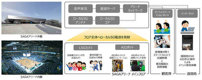本実証実験では、会場となるSAGAアリーナ内にて、スポーツの近接映像での体験、AIロボットを活用した遠隔テレポーテーションイベント参加を実施し、5G(ローカル5G)を用いたサイバー空間(仮想空間)とフィジカル空間(現実空間)を高度に融合させた「Society 5.0」時代のイベントについて、SAGAサンライズパークの利用者および佐賀県民に向けた、新時代のサービス提供について表現いたしました。