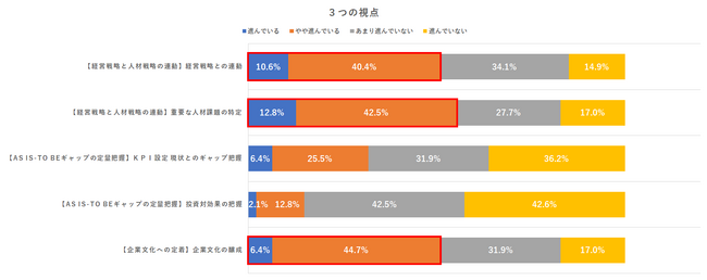■人材戦略3つの視点で取り組みが進んでいるのは「重要な人材課題の特定」、進んでいないのは「投資対効果の把握」