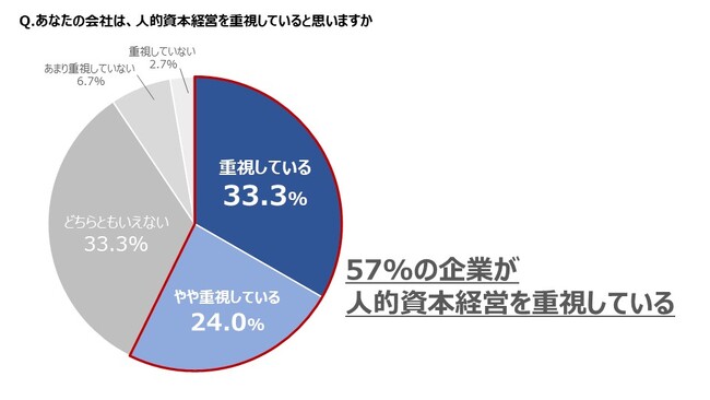 「あなたの会社は、人的資本経営を重視していると思いますか」という質問に対し、33.3%が「重視している」と回答。「やや重視している」と回答した24%と合わせると、およそ57%の企業が人的資本経営を重視していることがわかりました。