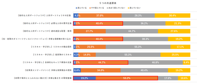 5つの共通要素について、特に取り組みが進んでいるのは「多様な働き方の環境整備」で、72.4%が進んでいる(「進んでいる」「やや進んでいる」の合計)と回答しています。コロナ禍にテレワークの導入が増えたことも、取り組みを推し進めた理由の1つだと考えられるでしょう。続いて、「自律的なキャリア構築の支援(同46.8%)」、「多様な価値観の取り込み(同42.5%)」、「必要な人材の要件定義(同42.5%)」となりました。