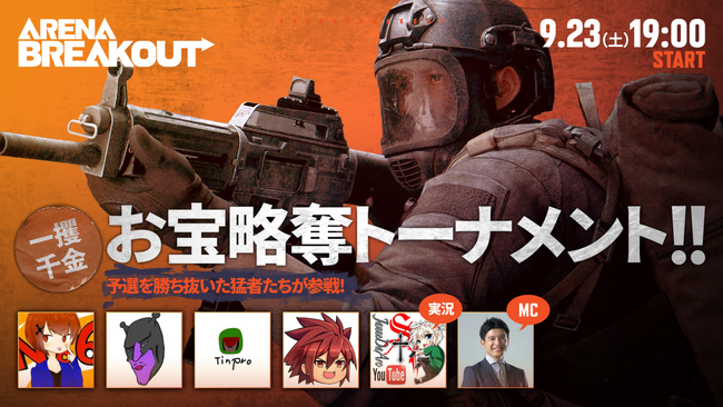 『Arena Breakout』初の日本開催となる賞金総額90万円のeスポーツ大会「一攫千金!お宝略奪トーナメント!」は、2023年9月4日(月)~2023年9月23日(土)の日程で開催され、人気ストリーマー総勢14名が「オンライン予選トーナメント」、「オンライン本戦トーナメント」、「オフライン決戦トーナメント」の3つのフェーズで競い合います。
