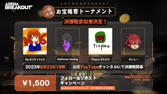 各Twitterキャンペーンとeスポーツ大会「一攫千金!お宝略奪トーナメント!」の最新情報は、Arena Breakout公式X(旧Twitter)「@ArenaBreakoutJP」または公式サイト(https://arenabreakout.com)にてお知らせします。ぜひチェックしてください!