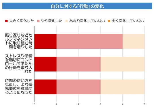 特に、自分を客観視し、リーダーシップの在り方を再発見したといった「自分への意識」に大きな変化が見られました。その他、行動面では、メンバー/部下とのコミュニケーションの方法や関わり方に変化が起きています。