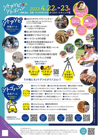 WESTボウサイアドベンチャー(複数の体験プログラム)、ソーセージ作り、はじめてのたき火体験、双眼鏡でアウトドアビンゴ、バードコール作り体験、国立天文台望遠鏡の組み立て、ソトアソビ商品の体験・販売、モルック体験・販売、アウトドアで使う刃物の展示と販売、ストーンペインティング体験、天体観測、キャンプと防災の展示など、その他にもソトアソビがたくさん!