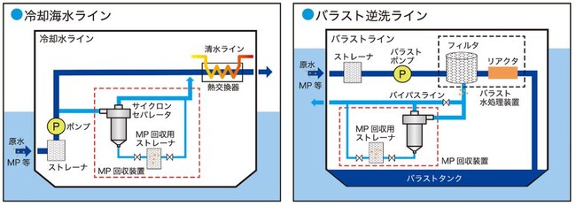 サイクロンセパレータにより海水中のMPを遠心分離させることで、配管を閉塞させることなく、効率よくMPを回収します。常に取水している海水ラインから常時MPの回収が可能になり、従来型では一部の処理に留まっていたバラスト水処理装置の逆洗排水も全量処理することが可能になりました。冷却海水ラインへの設置も可能で、処理後の海水は原水ラインに戻すことができるため、既存システムへの影響はほとんどありません。本船での日常作業はMP回収用ストレーナの清掃のみで簡単です。また、サイクロンセパレータの内面処理は耐腐食性に優れたポリエチレンライニングの採用により、耐久性、メンテナンス性が向上しました。