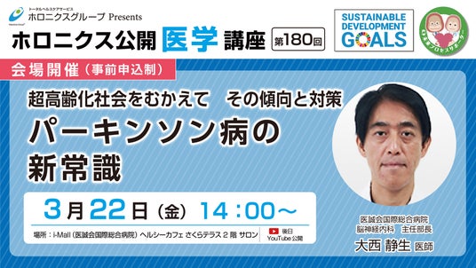 医療法人医誠会(大阪府大阪市 代表者:谷 幸治)では、第180回ホロニクス公開医学講座 『超高齢化社会をむかえて その傾向と対策 パーキンソン病の新常識」原因と治療』を大阪市北区南扇町にあるi-Mall内ヘルシーカフェ「さくらテラス 2階サロン」にて2024年3月22日(金)に開催いたします。