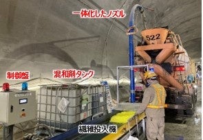 また、既存の覆工コンクリート用繊維投入機に、混和剤の自動添加装置を組み合わせ、混和剤と繊維をベースコンクリートに同時投入する仕組みとしました。添加率をもとに自動計量された混和剤は、タンクからノズルを通してアジテータ車に投入され、投入量は自動で記録されます。これにより、従来、人の手で行っていた混和剤の計量・投入および管理が自動化され、省力化を実現しました。