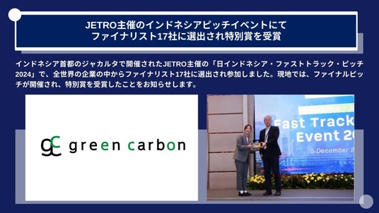 ネイチャーベースのカーボンクレジット創出販売事業を展開するGreen Carbon株式会社(代表取締役:大北潤、以下Green Carbon(読み:グリーンカーボン))は、インドネシア首都のジャカルタで開催されたJETRO主催の「日インドネシア・ファストトラック・ピッチ2024(以下、本イベント)」で、全世界の企業の中からファイナリスト17社に選出され参加しました。現地では、ファイナルピッチが開催され、特別賞を受賞したことをお知らせします。