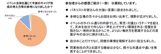 イベント開催後のアンケートでは、「イベント全体を通じて、今後のキャリア形成の考え方等の参考になりましたか?」という質問に対し、約87%の方から参考になったとの回答がありました。また、「仕事と育児の両立を図るためにキャリアを諦めなくてもいいと思えた。」や「仲間を作り、対話をすることの重要さを改めて感じられた。」という声が寄せられ、参加者一人ひとりにとって自分らしいキャリアを描くための気づきと仲間との繋がりを育む貴重な機会となったことがうかがえるイベントとなりました。