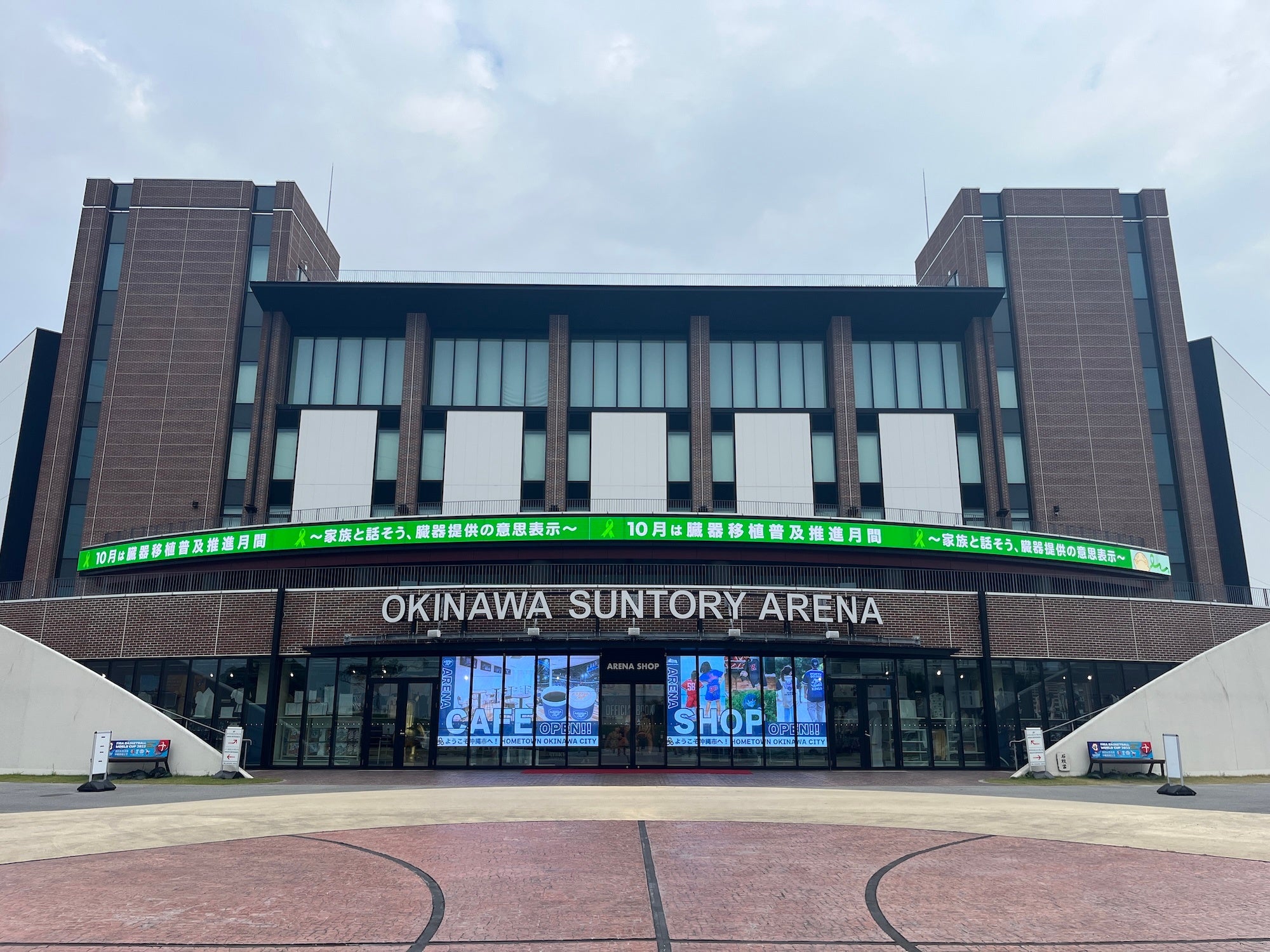 沖縄サントリーアリーナでは、10月16日(木)に外部ビジョンおよび外壁照明を活用し、臓器移植普及推進月間のシンボルカラーであるグリーンのライトアップを実施します。