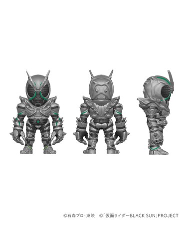 フィギュアアーティストTOUMAデザインによるフィギュア「仮面ライダーBLACK SUN」「仮面ライダーSHADOWMOON」。TOUMAの特徴でもあるディフォルメで手の末端が大きくなったかわいい形状に落とし込みつつ、2人のライダーの良さを損なわないように、細かなディテールをしっかりと残してデザインされています。