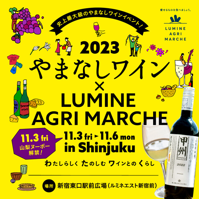 株式会社ルミネ(本社:東京都渋谷区、代表取締役社長:表輝幸)は、第3弾となる「やまなしワイン×LUMINE AGRI MARCHE 2023」を11月3日(金・祝)から11月6日(月)までの4日間開催いたします。イベントには、山梨ワイン総勢約70ワイナリー、約200銘柄が参加し、史上最大級のやまなしワインイベントとなっています。
