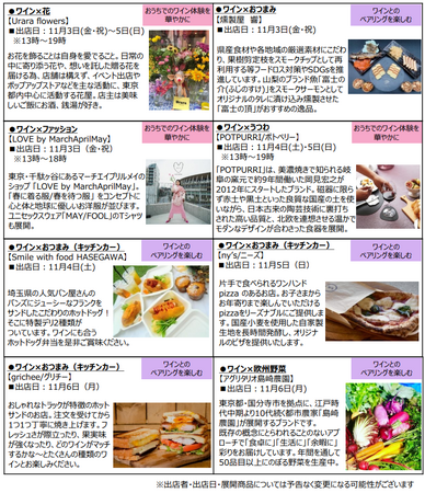 また、マルシェブースには「わたしらしいワインのたのしみかた」をテーマに、ワインとのくらしがもっと楽しくなる、8つのごきげんなショップが日替わりで登場。ワインのある食卓を彩るうつわやお花、ワインとの変幻自在なペアリングを楽しむおつまみや欧州野菜、コットンや麻などワインと同じ自然素材から生まれたお洋服たち。ワインと一緒に楽しみたい素敵なモノが揃います。