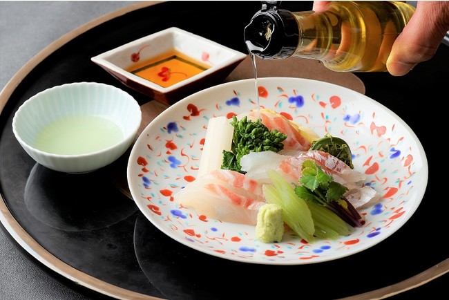今回は、明石鯛をさらに美味しくする「柚子あぶら」と「割り出汁」、そして季節のゆで野菜を付けます。