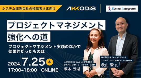 株式会社システムインテグレータ(本社:さいたま市中央区、代表取締役社長:引屋敷 智、東証スタンダード:証券コード3826)は、AKKODiSコンサルティング株式会社(本社:東京都港区、代表取締役社長:川崎 健一郎)と共催で、「プロジェクトマネジメント強化への道 ~プロジェクトマネジメント実践のなかで効果的だったものは~」と題した無料ウェビナーを、2024年7月25日(木)に開催することをお知らせします。