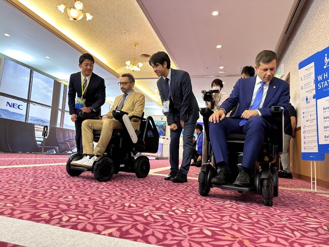 WHILL社は、日本が誇る最先端技術を駆使した空港をモデルにしたステージで、WHILL自動運転サービスのデモ体験を行いました。実際に、米国のピート・ブティジェッジ運輸長官、英国のマーク・ハーパー運輸大臣、カナダのオマール・アルガブラ運輸大臣、イタリアのエドアルド・リシ交通副大臣にご乗車いただき、自動運転で目的地まで移動し、帰りは無人運転で返却される様子をご体感いただきました。体験中は皆笑顔で、「スムーズだ」「とてもいい」などの感想をいただいたほか、障害物検知時に発せられる注意喚起の音声が流れた際には「(モビリティが)喋っている」といった驚きの声も上がりました。