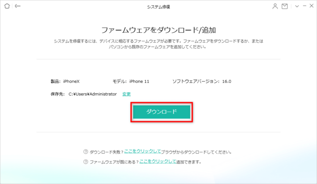 Step 5:iPhone/iPad/iPod touchのモデル情報を確認し、「ダウンロード」ボタンをクリックしてファームウェアバッケージをダウンロードします。