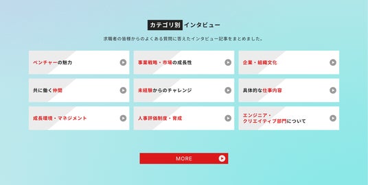 サイバー・バズのビジネスモデルや今後の展望について、より深く理解できるよう詳細に解説しました。また、各職種の社員インタビューを充実させ、仕事内容やキャリアパスが具体的にイメージできる構成に。さらに、求職者の皆様からよくある質問に答えたインタビューをカテゴリ別に用意し、必要な情報へスムーズにアクセスできるよう工夫しています。