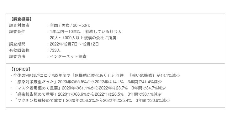 Job総研では733人の社会人男女を対象に、コロナへの危機感、感染対策、マスク着用、感染報告、ワクチン接種、政府のコロナ対策への関心度などさまざまな観点から3年間の意識や行動の変化を調査した「2022年 コロナ禍の行動変化調査」を実施しました。
