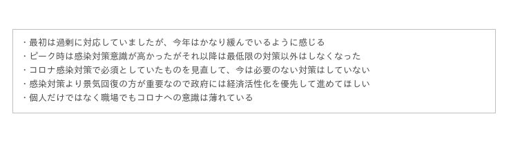 コロナ禍の意識や行動変化と今後の意識に関するコメントが顕著に見られました