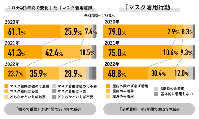 2020年~2022年の3年間で「マスク着用意識」の変化を聞くと、「マスクは極めて重要」の回答が2020年では61.1%だったのに対して、2021年には41.3%に下がり、2022年は23.7%にまで下がっています。また「マスクは極めて重要」と「マスクは必要」を合算した回答でも、2020年は87.0%に対して、2021年は83.7%でほぼ横ばい、2022年には59.6%に減少する推移になりました。