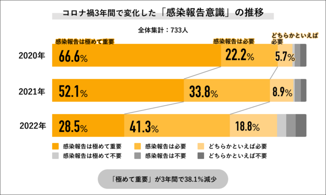 2020年~2022年の3年間で「感染報告意識」の変化を聞くと、「感染報告は極めて重要」の回答が2020年では66.6%だったのに対して、2021年には52.1%に下がり、2022年は28.5%にまで下がっています。また「報告は極めて重要」と「報告は必要」を合算した回答でも、2020年は88.8%に対して、2021年は85.9%でほぼ横ばいですが、2022年には69.8%と減少する結果になりました。