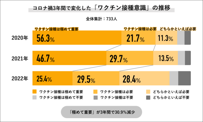 2020年~2022年の3年間で「ワクチン接種意識」の変化を聞くと、「接種は極めて重要」の回答が2020年では56.3%で半数以上だったのに対して、2021年には46.7%に下がり、2022年は25.4%にまで下がっています。また「接種は極めて重要」と「接種は必要」を合算した回答でも、2020年は78.0%に対して、2021年は76.4%とほぼ横ばいですが、2022年は54.9%と大きく減少する結果になりました。