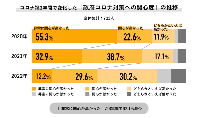 2020年~2022年の3年間で「政府コロナ対策への関心度」の変化を聞くと、「非常に高かった」の回答が2020年では55.3%と半数以上だったのに対して、2021年には32.9%に下がり、2022年は13.2%にまで下がっています。また「非常に高かった」と「高かった」を合算した回答でも、2020年は77.9%に対して、2021年は71.6%と微減し、2022年は42.8%と大きく減少する結果になりました。