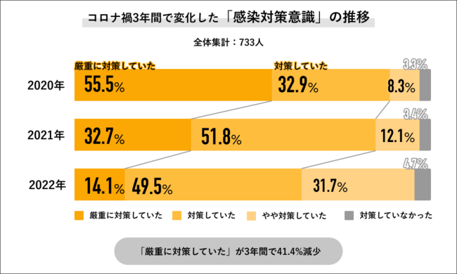 2020年~2022年の3年間で「感染対策意識」の変化を聞くと、「厳重に対策していた」の回答が2020年では55.5%で半数以上だったのに対して、2021年には32.7%に下がり、2022年は14.1%にまで下がっています。また「厳重に対策していた」と「対策していた」を合算した回答でも、2020年は88.4%に対して、2021年は84.5%で、2022年は63.6%と大きく減少する結果になりました。