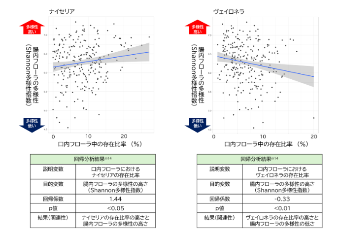 また、ナイセリア、ヴェイロネラについて、口内フローラ中の存在比率に着目すると、ナイセリアの存在比率が高い人ほど腸内フローラの多様性が高いこと、ヴェイロネラについては、存在比率が高い人ほど腸内フローラの多様性が低いことが分かりました(図3)。