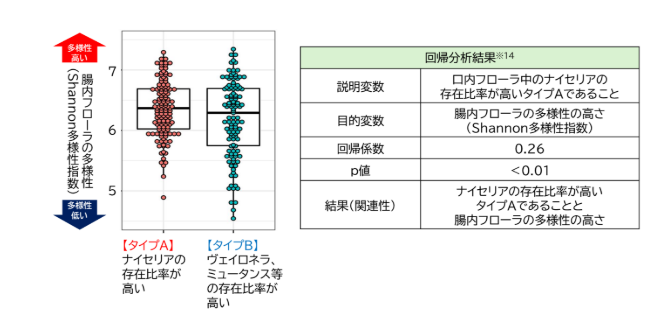 2タイプについて腸内フローラの多様性(Shannon多様性指数※13)との関連性を解析した結果、口内フローラ中のナイセリアの存在比率が高いタイプAは、腸内フローラの多様性が高い傾向にあることが示されました(図2)。