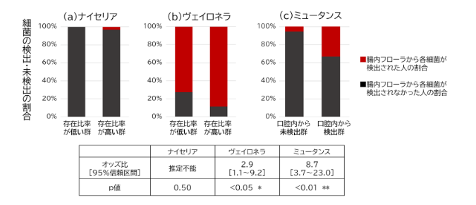 各菌については、247名のサービス利用者全員の口腔から検出されたものを用いて解析。(a)ナイセリアと(b)ヴェイロネラについては、各菌の口内フローラ中の存在比率が高い群(上位25%)と低い群(下位25%)に分け、腸内フローラから検出の有無を確認した。(c)ミュータンスについては、口内フローラから検出される人と検出されない人がいたため、検出群と未検出群に分け、腸内フローラからの検出の有無を確認した