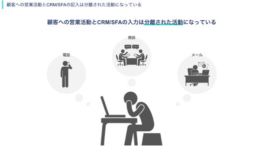 従来のCRM/SFAでは、営業が顧客に対して行ったコミュニケーション(メール・電話・オンライン商談・訪問記録)の内容を社内の管理のために営業活動とは別に入力する必要があり、これが二重記載や手間を生み出していました。その結果、営業が全ての活動をCRM/SFAに入力することができず、結果としてCRM/SFAにデータが貯まらないという問題を抱えている企業様も多く存在します。