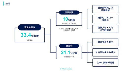 また、実際のユーザーにヒアリングを行った結果、営業活動に付帯する業務にかけていた時間の10%の工数を削減がされたことを確認しました。
