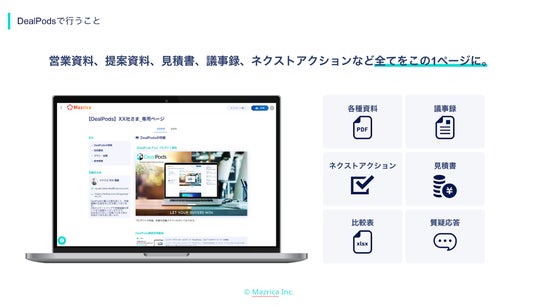 株式会社マツリカは、デジタルセールスルーム「DealPods」(以下、本サービス)において、日本でのさらなるデジタルセールスルームの浸透のため機能アップデートを実施しました。(https://product-senses.mazrica.com/lp-enterprise-sales-dealpods-io)