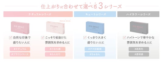 自然に垢抜け「ナチュラルシリーズ」、かわいく盛れる「キュートシリーズ」、透明感&高発色「ハイカラーシリーズ」。ナチュラルから高発色まで、気分に合わせてお選びいただけます。