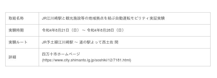 なお、本実証実験についての詳細は、四万十市ホームページ「JR江川崎駅~道の駅『よって西土佐』を拠点とした自動運転サービス実証実験について」(https://www.city.shimanto.lg.jp/soshiki/12/1442.html)をご覧ください。
