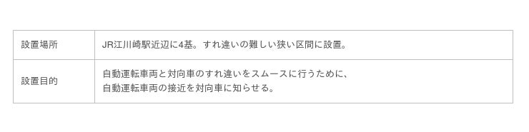 本実証実験では、自動運転車両の通行ルートのうち、すれ違いの難しい狭小区間でのスムースで安全な運行を実現するため、自動運転車が対向接近してきていることを一般車両に知らせる「対向車接近表示器」として「ICT LED」が使用されます。「ICT LED」の点灯は車両側のセンサーと連動して行われます。「ICT LED」は、自動運転車両と連動して点灯させることにより、対向する一般車両に注意を促す「対向車接近表示器」として機能します。