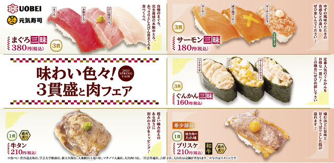 寿司レストランチェーンを展開する元気寿司株式会社(本社:栃木県宇都宮市 代表取締役会長兼社長 藤尾 益雄)は、4月20日(木)より『味わい色々!3貫盛と肉フェア』を開催いたします。魚べい・元気寿司イチ押しである「まぐろ」「サーモン」「ぐんかん」の、3種の食べ比べを楽しめる寿司3貫盛と、幅広い世代から人気のある牛タンや希少部位「ブリスケ」を使用した肉寿司をお値打ち価格で提供いたします。ぜひこの機会に、お近くの魚べい・元気寿司をご利用ください。