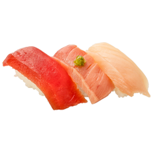人気NO.1の「まぐろ」、当社専用の生け簀で育てた自慢の「完全養殖本鮪中とろ」、さっぱりとした風味が特徴の「びん長まぐろ」をお値打ち価格で堪能できる贅沢な一皿です。