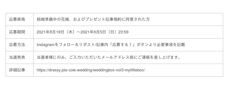 今回はDRESSY編集部がオススメしたいのは『My Little Box』。過去人気だったボックスをサプライズでご用意しました。応募方法は、Instagramをフォロー&リポスト・応募フォームへの必要事項の記載となっており、結婚準備中のすべての花嫁を対象としたプレゼント企画となっております。