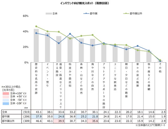 インバウンド旅行者にアピールする観光スポットについてたずねたところ、「歴史的な名所や史跡」が最も多く挙げられました。次点には、都市圏では「街並みや商店街」が、都市圏以外では「イベント・祭り」が挙げられました。都市圏以外は「温泉・銭湯などリラックスできる施設」や「海や川などの自然」が、都市圏よりも多い結果でした。