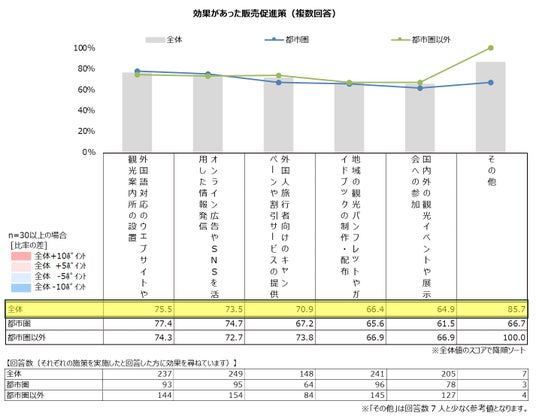 効果的だったインバウンド施策として上位に挙がったのは、「外国語対応のウェブサイトや観光案内所の設置」「オンライン広告やSNSを活用した情報発信」「外国人旅行者向けのキャンペーンや割引サービスの提供」でした。これらの施策により、訪日旅行の可能性のある潜在顧客にアピールして認知度を上げ、キャンペーンやサービスなどで一層の動機づけを図ることが重要であると考えられます。