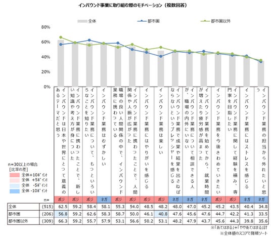地方自治体勤務かつインバウンド領域に関与している、都市圏勤務者206人/都市圏以外勤務者309人の計515人にアンケート調査を実施した。