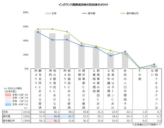 全国の地方自治体でインバウンド施策に携わる職員515人に、インバウンド施策成功時のメリットについてたずねたところ、観光名所、地元飲食店、宿泊施設における経済的メリットが上位に挙げられました。特に都市圏以外の自治体において、この3つの経済メリットへの期待が大きい傾向が見られました。続いて、既存事業や新規事業における雇用の増加を挙げる回答が3割以上あり、若年層の増加や人口の増加という回答も2割以上ありました。