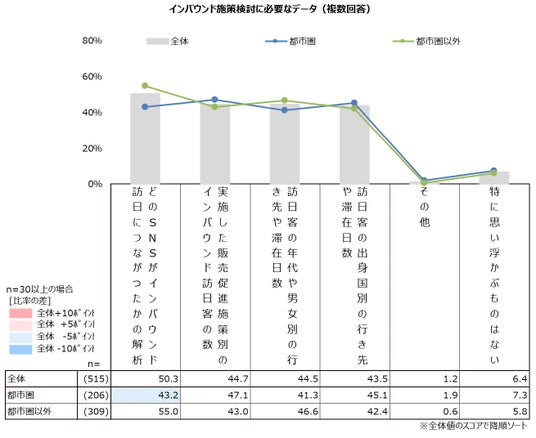 インバウンド施策検討の上で必要な分析データをたずねたところ、「どのSNSがインバウンド訪日につながったかの解析」が最も多く挙げられ、特に都市圏以外での割合が多い結果でした。次いで「実施した販売促進施策別のインバウンド訪日客の数」、「訪日客の年代や男女別の行き先や滞在日数」、「訪日客の出身国別の行き先や滞在日数」への要望が挙げられました。