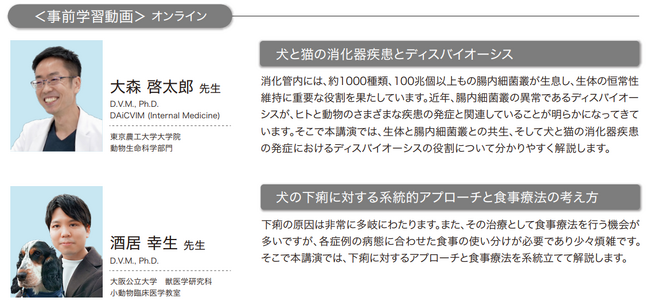 さらにシンポジウム特設サイトでは、7月10日(月)~8月20日(日)の期間中、消化器疾患と腸内細菌叢の関連、消化器疾患に対する体系的な診断アプローチに関する情報が満載の事前学習動画を公開しており、講演内容の理解を深めていただくための予習・復習にご活用いただけます。その他にも下痢と便秘に関するeラーニングやQUIZムービー、フランス本社においてロイヤルカナンのフードがどのようにつくられているかを紹介するキャンパスバーチャルツアーに加え、愛玩動物看護師の方向けに栄養学からマネジメントまで動物看護力を高め長く働いていただくためのレクチャー動画を、上記期間中いつでもご覧いただけます。