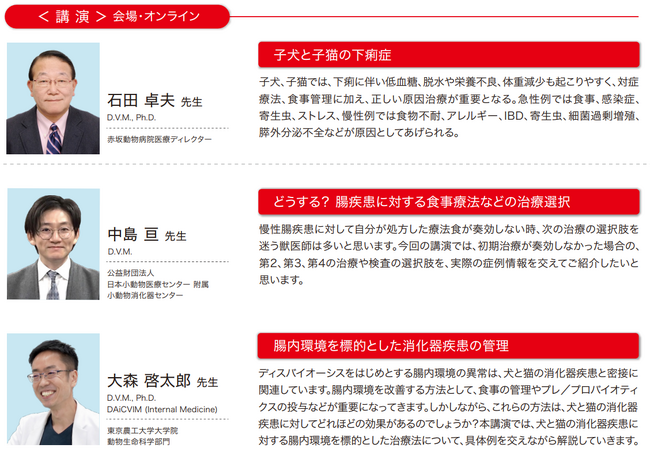 ベテリナリーシンポジウムは、ロイヤルカナン ジャポンが獣医療業界のサステナブルな発展支援を目的に、全国の獣医療関係者を対象に毎年開催しているシンポジウムです。今回は、ロジックで攻める「消化器疾患クリニカルアップデート」をテーマに、石田卓夫先生(赤坂動物病院医療ディレクター)による「子犬と子猫の下痢症」をはじめ、中島亘先生(公益財団法人 日本小動物医療センター附属 小動物消化器センター)による「どうする?腸疾患に対する食事療法などの治療選択」、大森啓太郎先生(東京農工大学大学院 動物生命科学部門)による「腸内環境を標的とした消化器疾患の管理」と、獣医療のエキスパートによる講演を各会場とオンライン配信のどちらからも聴講いただけます。