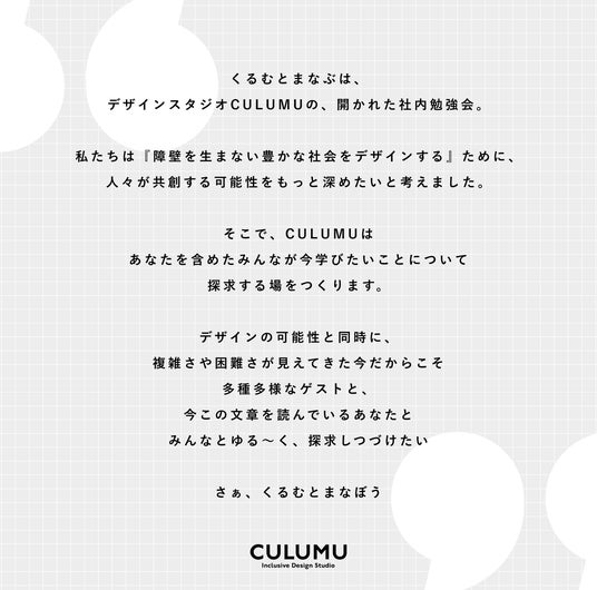 デザインスタジオCULUMUのメンバーが今学びたいことについて、様々な領域で活躍されている方々をお招きして学んでいきます。くるむとまなぶは、開かれた社内勉強会です。