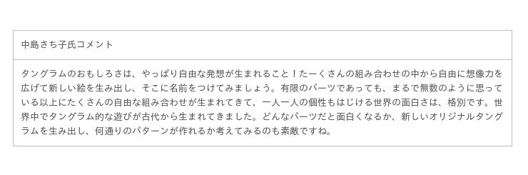 タングラム(正方形をいくつかに切り分けたものを使うパズル)には、様々なメリットがあります。試行錯誤することで、考える力が身につきます。パズルが解けたときには達成感が得られます。また、その過程において集中力や図形感覚が身につきます。3ピース、4ピース、7ピースと対象年齢に応じて難易度を選ぶことができます。